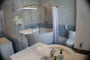 Ванная комната: ванна, умывальник, унитаз, туалетные принадлежности.